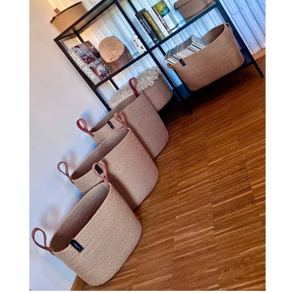 Oválný koš z juty s uchy na "cokoliv". Tak akorát na časopisy pro časopisomilce, na pletení ale třeba i na toaletní papír. Větší varianty pak na prádlo, polštáře či deky ke gauči. Zkrátka jak je libo, jak se zrovna hodí. Nově pouze s koženými uchy. Na přání lze ušít i starší variantu s jutovými uchy.
